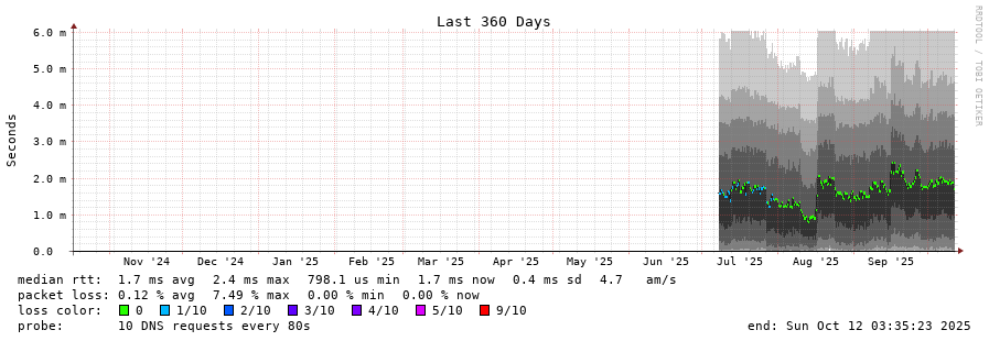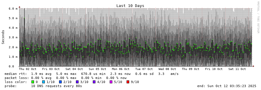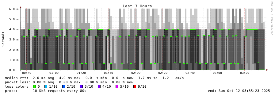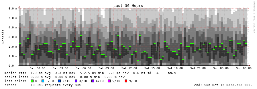 traceroute to 2001:500:2f::f (2001:500:2f::f), 30 hops max, 80 byte packets - Generated at 2025-10-12 03:30:01 3 > f.root-servers.net (2001:500:2f::f) [AS3557] 1.048ms 1.019ms 1.012ms