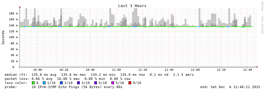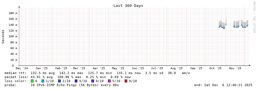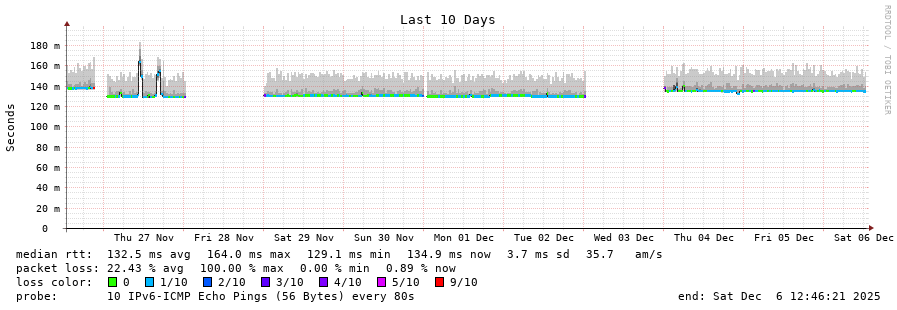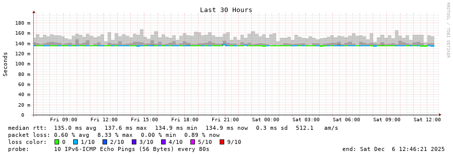 traceroute to 2001:470:1f13:814:1ad6:c7ff:fe2a:502 (2001:470:1f13:814:1ad6:c7ff:fe2a:502), 30 hops max, 80 byte packets - Generated at 2025-12-06 12:30:01