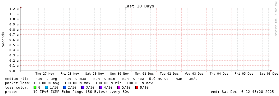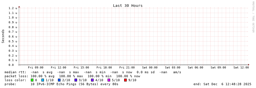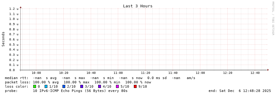 traceroute to fd69:226f:3a3c::2 (fd69:226f:3a3c::2), 30 hops max, 80 byte packets - Generated at 2025-12-06 12:45:01 3 > 4 > 5 > 6 > 7 > 8 > 9 > 10 > 11 > 12 > 13 > cogent.as174.nj.us (2607:5300::2559) [AS16276] 2.363ms !N