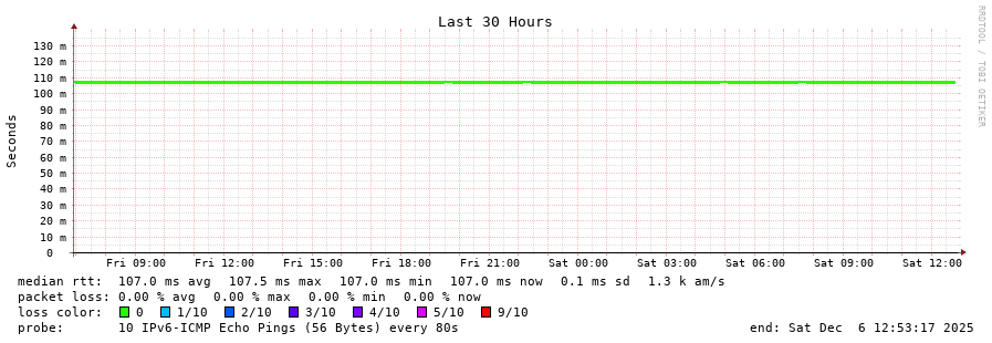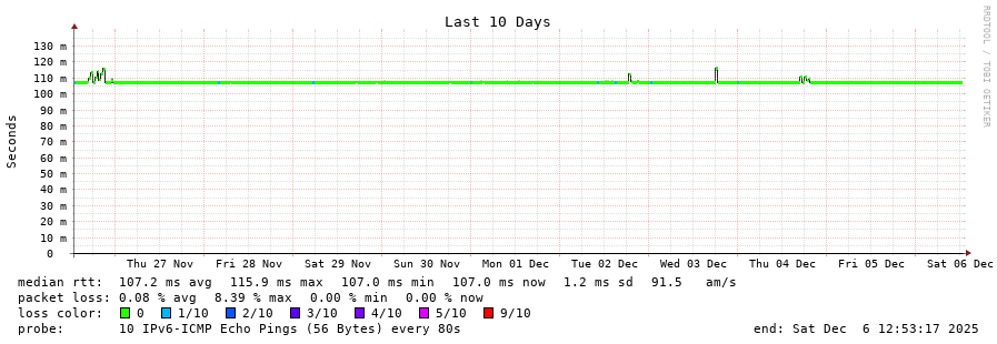 15 > 2001:730:2601:f005::2 (2001:730:2601:f005::2) [AS6830] 108.012ms 107.939ms 107.947ms