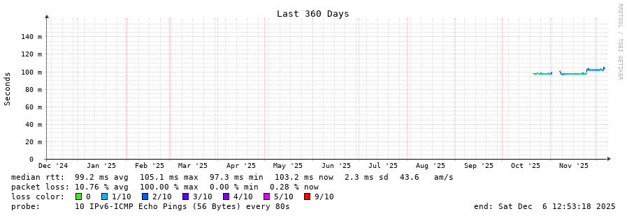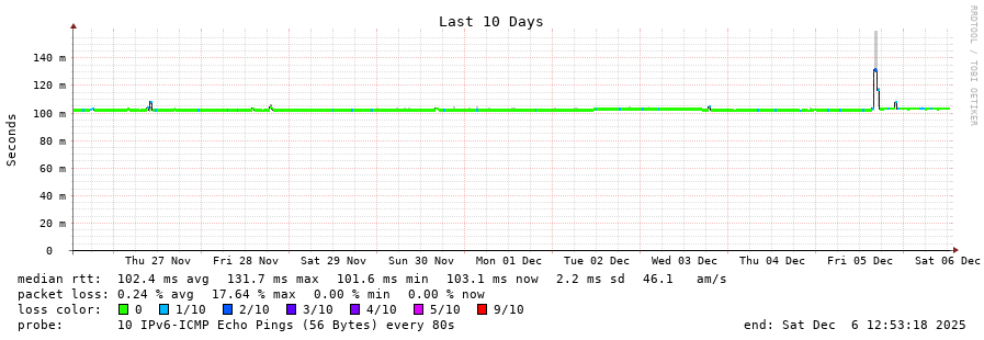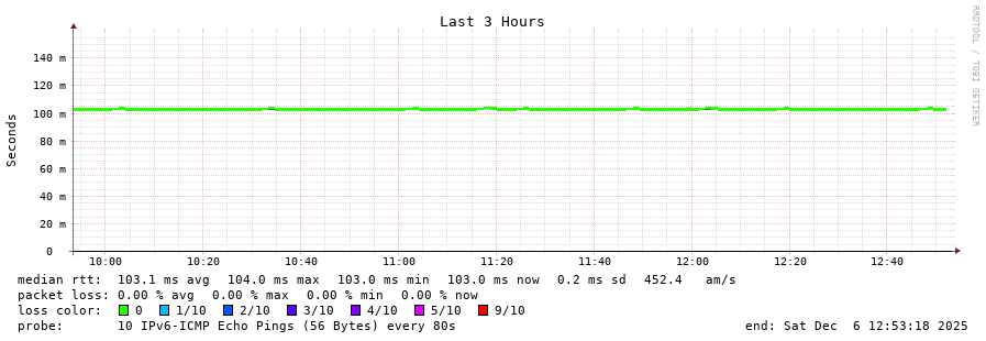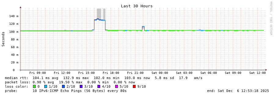 traceroute to 2a00:c30:bbbb:d::2 (2a00:c30:bbbb:d::2), 30 hops max, 80 byte packets - Generated at 2025-12-06 12:45:01