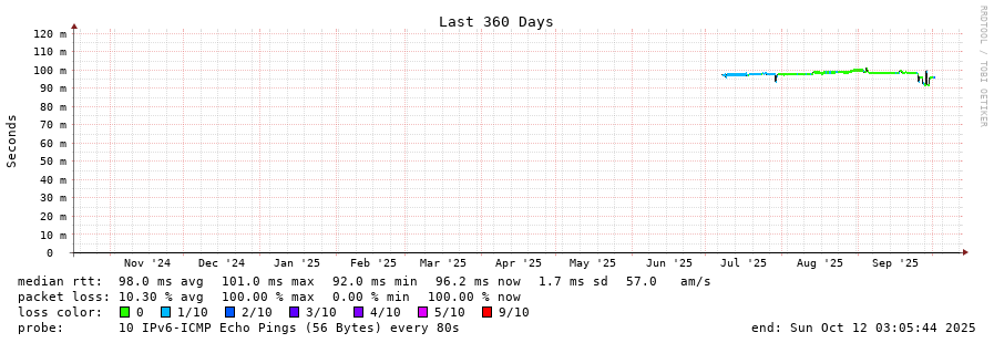 traceroute to 2a00:c560:c0c0:1a1a::9 (2a00:c560:c0c0:1a1a::9), 30 hops max, 80 byte packets - Generated at 2025-10-12 01:00:01