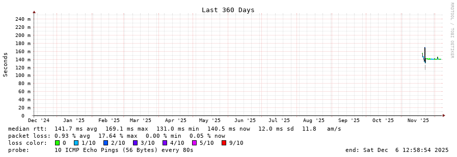 traceroute to 138.0.20.93 (138.0.20.93), 30 hops max, 60 byte packets - Generated at 2025-12-06 12:45:01 3 > 4 > 5 > 6 > 138.0.20.93 (138.0.20.93) [AS264528] 140.344ms 141.218ms 140.343ms