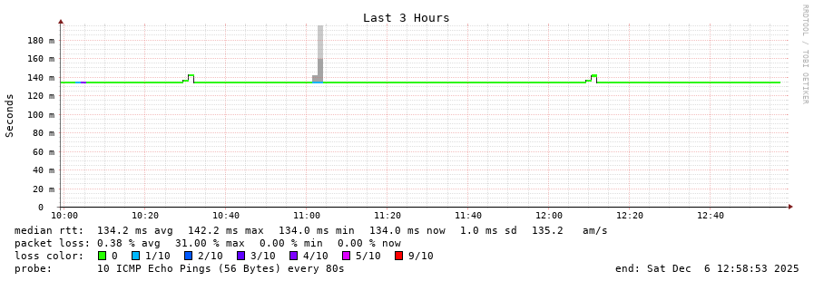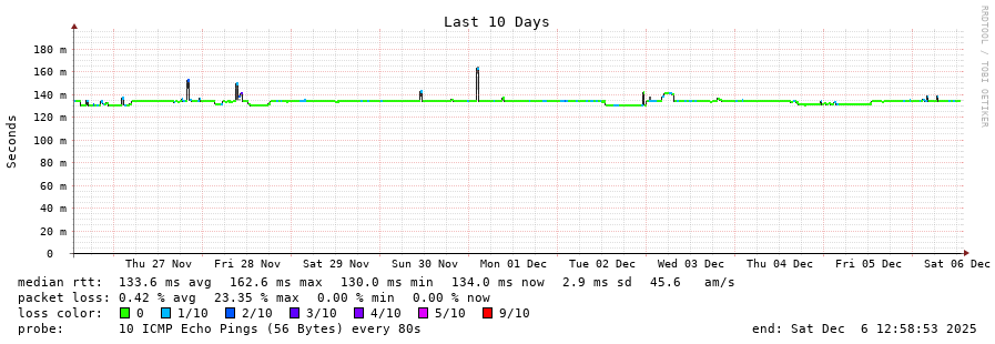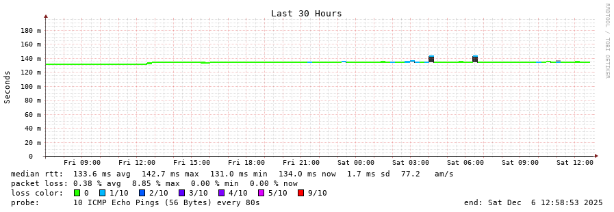 traceroute to 170.79.27.9 (170.79.27.9), 30 hops max, 60 byte packets - Generated at 2025-12-06 12:45:01 3 > 4 > 5 > 6 > 7 > 8 > 9 > 10 > 11 > 12 > 13 > 170-79-27-9.allrede.tec.br (170.79.27.9) [AS273683] 134.368ms 134.331ms 134.301ms